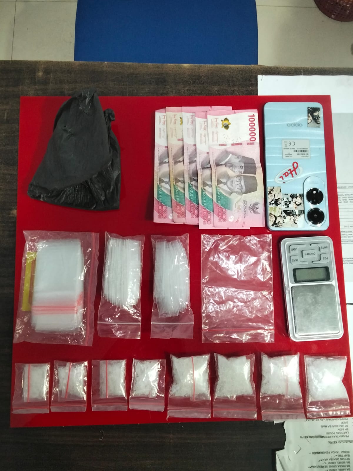 Dari tangan tersangka, polisi menyita delapan paket sabu yang dibungkus plastik klip bening dengan total berat kotor 54,74 gram. Selain itu, turut diamankan satu lembar plastik klip bening, tiga pak plastik kosong, satu kantong plastik hitam, uang tunai sebesar Rp500.000, satu unit timbangan digital, serta satu unit telepon genggam merek OPPO warna biru muda.
